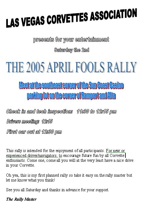 April 2, Sat | April Fool's Rally (RE) Event flyer: [JPEG format] [Word format] Check-in & tech inspection: 11:30-12:15 Drivers' Meeting: 12:15 First car out: 12:30 | Keith Riemer |