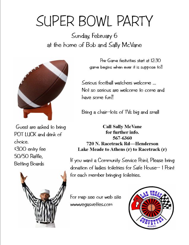 February 6, Sun | Super Bowl Party Pre-game festivities start at 12:30 Map of the party's location | Bob & Sally McVane (567-6360) |