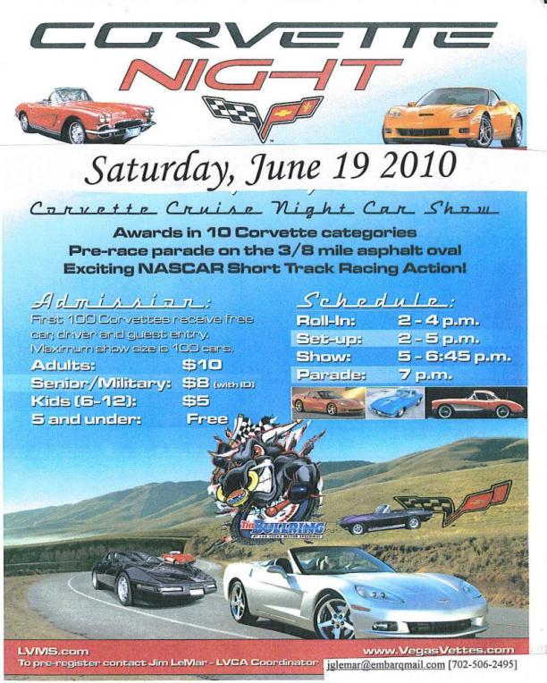 June 19 | Corvette Night - LVMS Bullring | Free | Jim LeMar | Flyer |