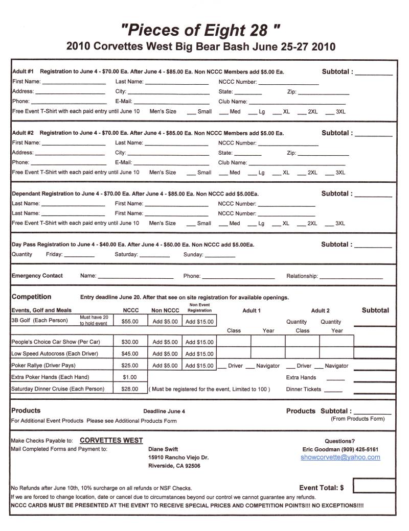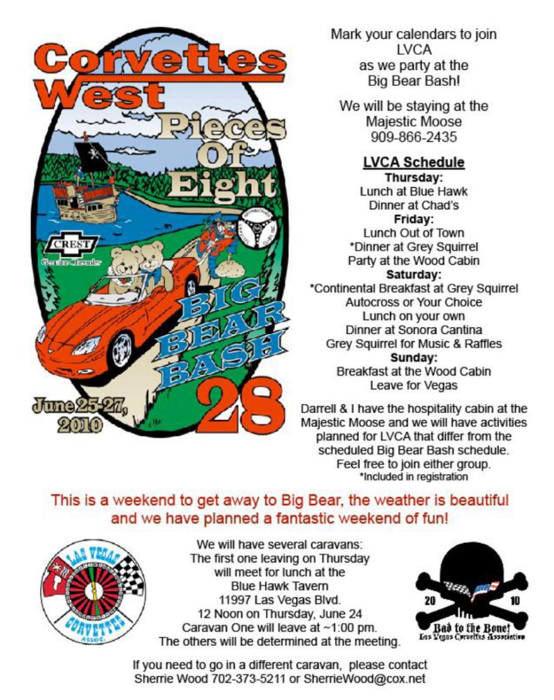 June 25 - 27 | *Big Bear Bash - Corvettes West (NCCC) | See Reg Form | Sherrie Wood | Flyer1 Flyer2 Reg Form |
