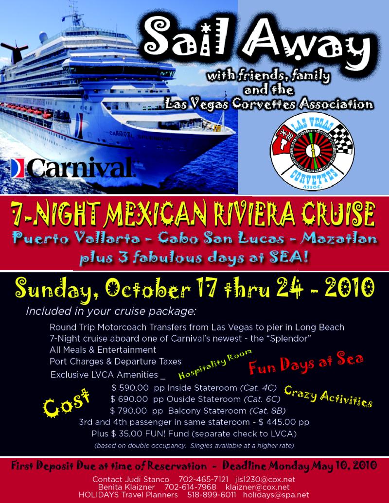 October 17 - 24 | *Mexican Riviera Cruise - Carnival ship "Splendor". Included is the round trip from Las Vegas to Long Beach. Note: Final payment due by July 24, 2010 see Latest Info | $625-$825/per person (pp) | Benita Klaizner Judi Stanco | Flyer Add Info Latest Info |