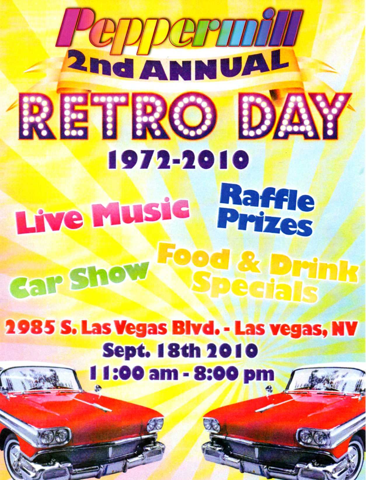 September 18 | Peppermill 2nd Annual RETRO DAY Car Show | $25/car | Martha Montague | Flyer Reg Form |