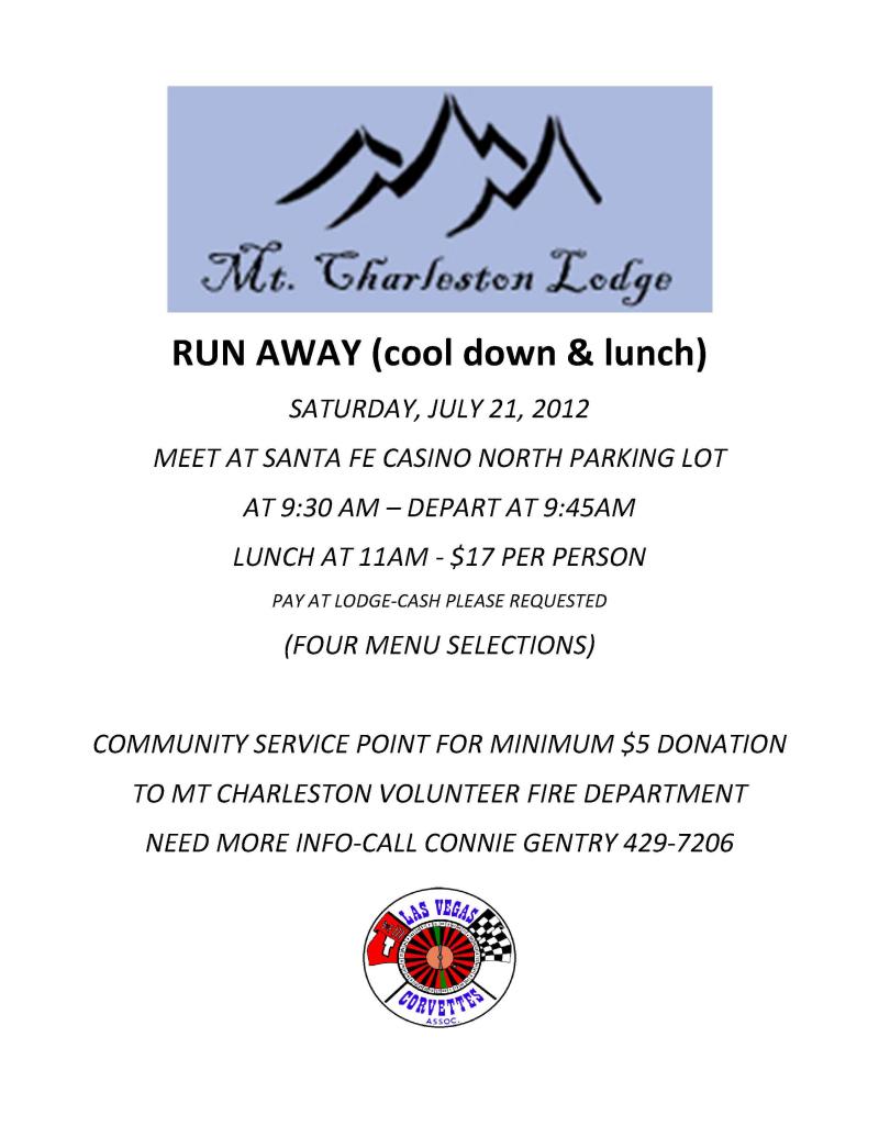 July 21 | *Mt. Charleston Lodge - Runaway for Lunch (CS) | $17 Lunch/pp $5 (CS) |