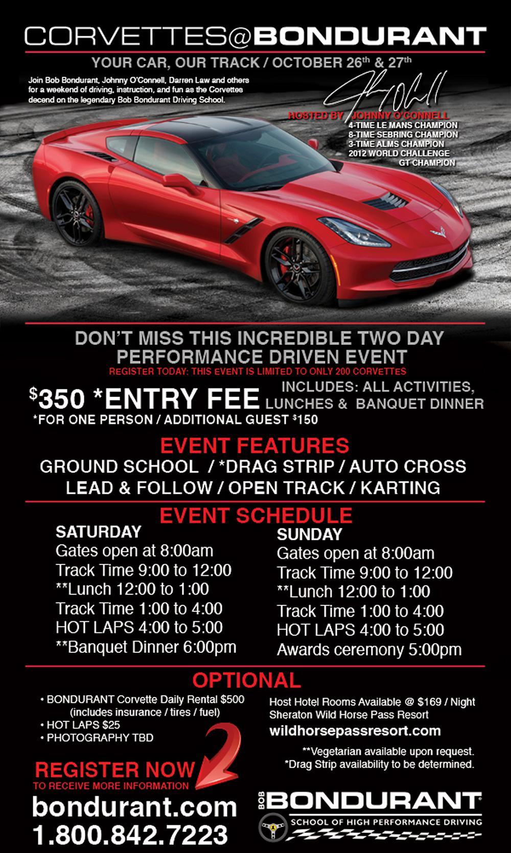 October 26 -27 | Corvette Track Days - Bondurant Driving School, AZ | $350+ | Flyer | |