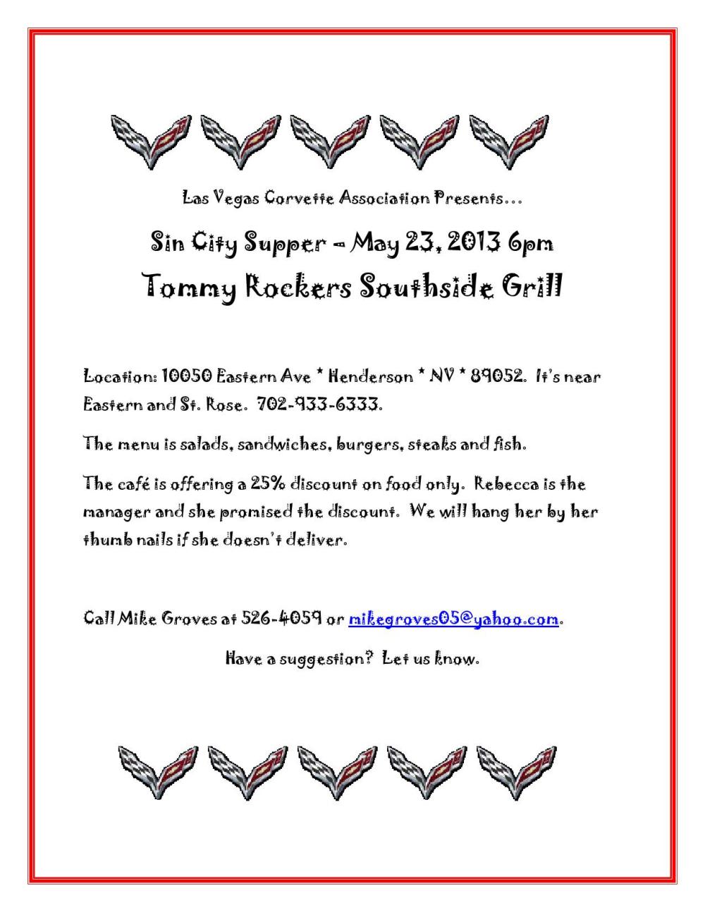 May 23 | Sin City Supper - Tommy Rockers Southside Grill @ 6PM | Mike Groves | Flyer | |