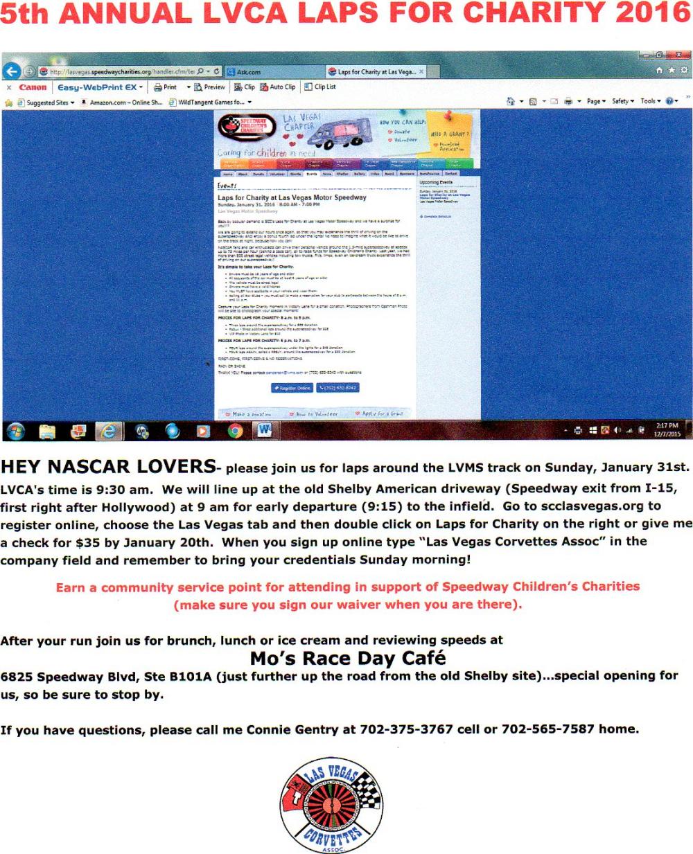 January 31 | Laps for Charity at LVMS (CS) | $35/car | Connie Gentry | Flyer Online Reg |