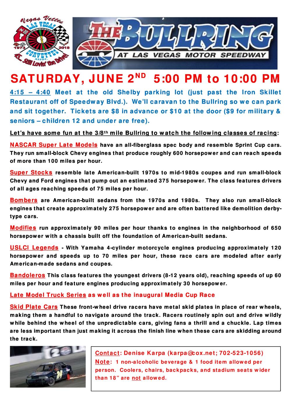 June 2 | The Bull Ring at LVMS | $10/person | Denise Karpa | Flyer |