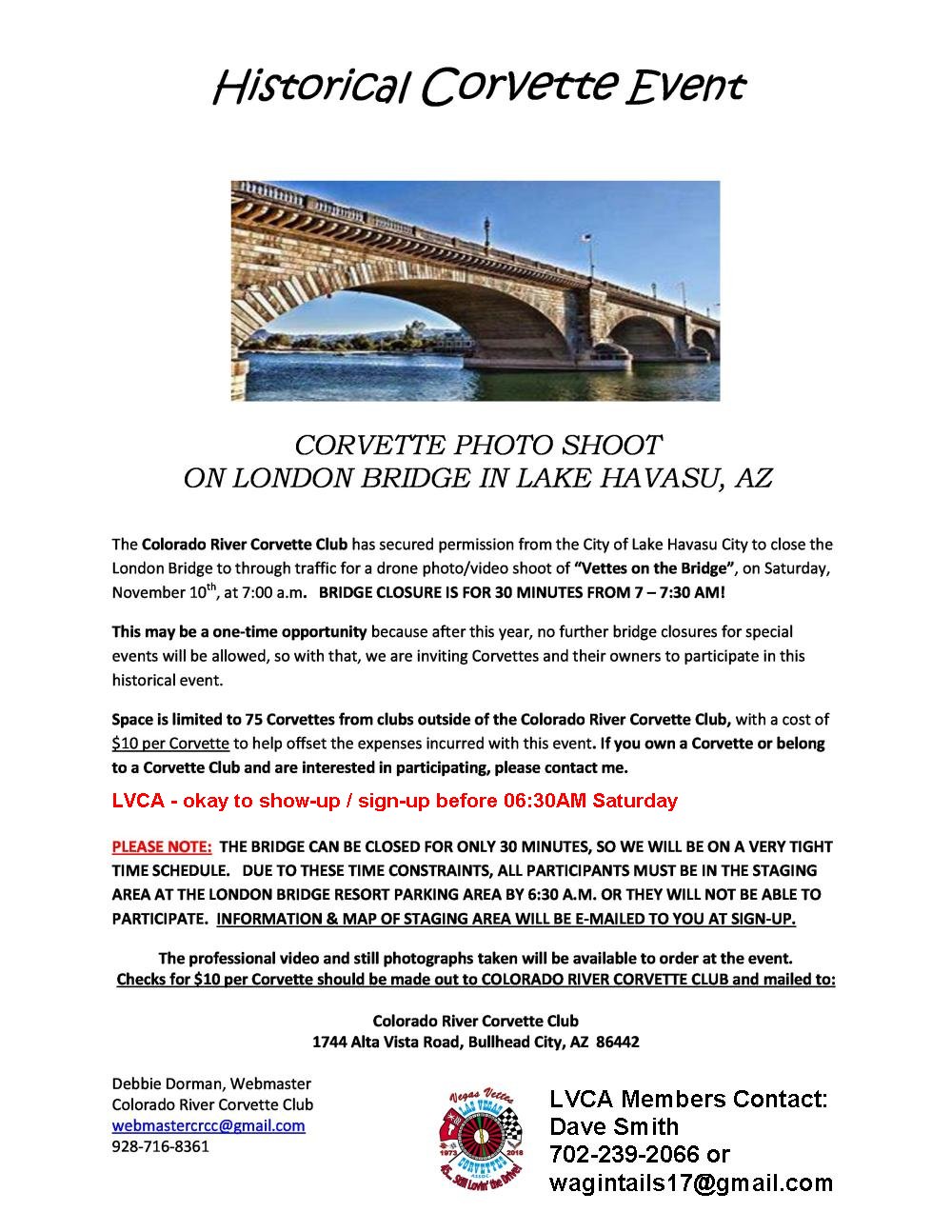 November 10 | Corvette Photo Shoot on the London Bridge | $10/Corvette | Dave Smith | Flyer |