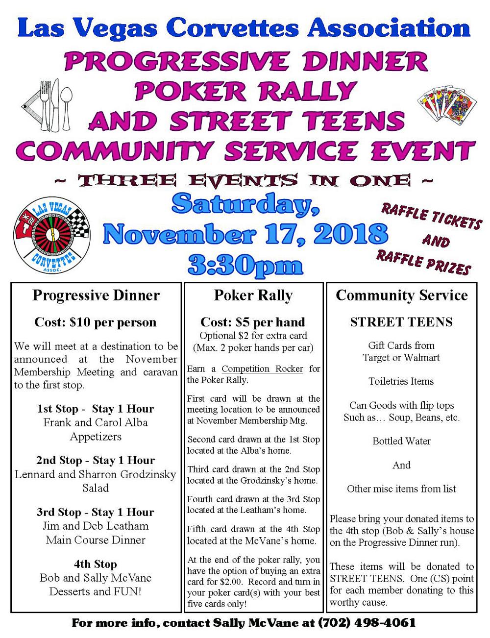 November 17 | Three In One Poker Run/Progressive Dinner (CS) | See Flyer | Sally McVane | Flyer |