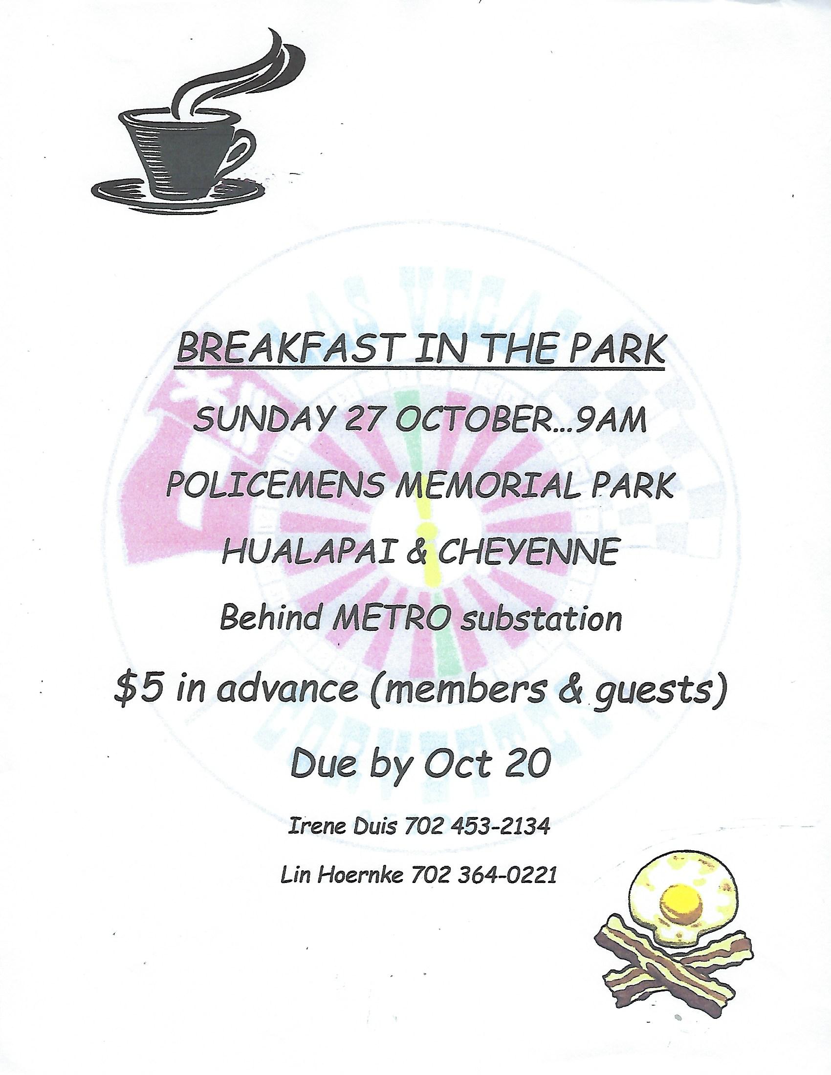 October 27 | Breakfast in the Park - Police Memorial Park (CS) | Irene Duis | Flyer | |