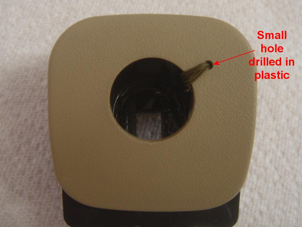 With the latch removed, note the hole drilled on the right side and the green string. The green string connects the latch cover to the silver lever - so you can stick your finger in the hole where the lock cylinder was an pull, the glove box will open. This is just a temp fix until a new latch is installed. |